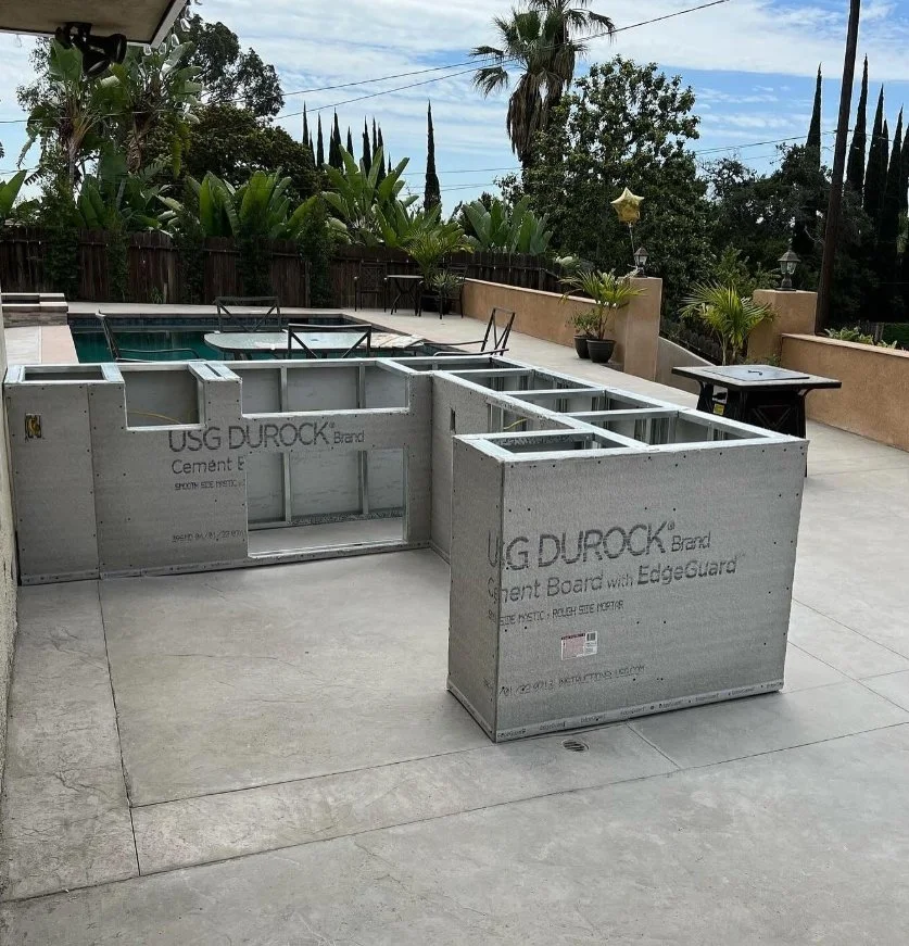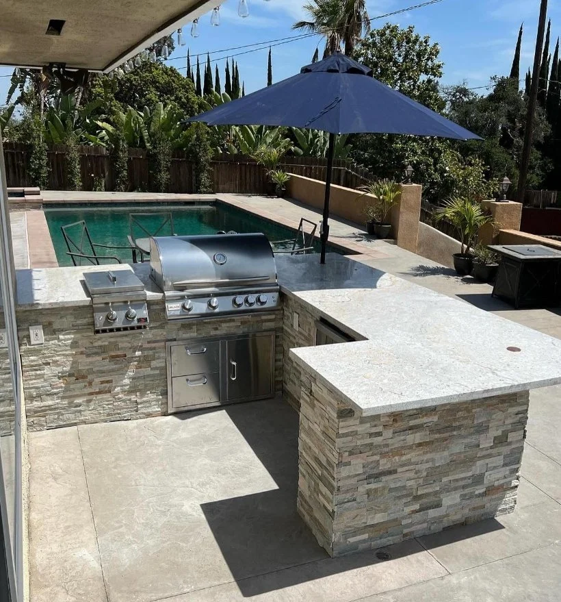 This project includes a built-in stainless-steel grill and side burner, surrounded by stacked stone for a warm, natural look. We added high-quality stone countertops for a large, durable prep and serving area that resists heat, sun, and outdoor use. These outdoor spaces turn your yard into an extension of your home, using materials that look good and last through all weather.