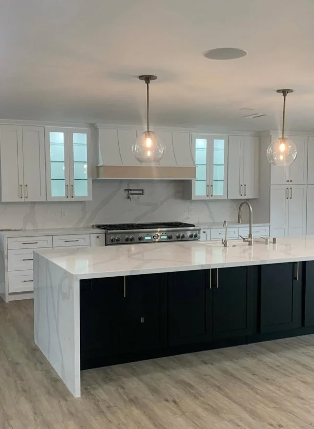 This remodel features custom shaker-style cabinetry to the ceiling, maximizing storage and creating a high-end look. The White cabinets with black hardware offer a modern, timeless contrast. Pure white quartz countertops provide a durable, low-maintenance, and elegant surface. Warm wood-tone flooring adds an inviting, natural balance. These thoughtful material choices deliver custom cabinetry, stunning countertops, and grounding flooring for lasting style and function.