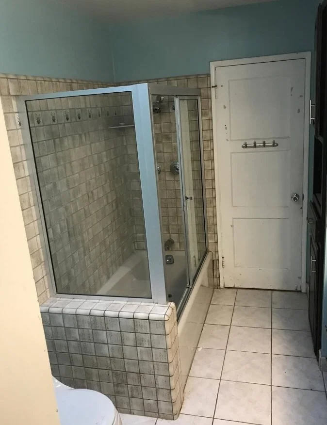 The shower has large quartz tiles, a built-in shelf, a frameless glass door, and a rainfall showerhead for a spa feel. Patterned floor tiles add style without overcrowding the space. The vanity has a white quartz top for a durability and clean look, with brushed nickel fixtures for a modern touch.
