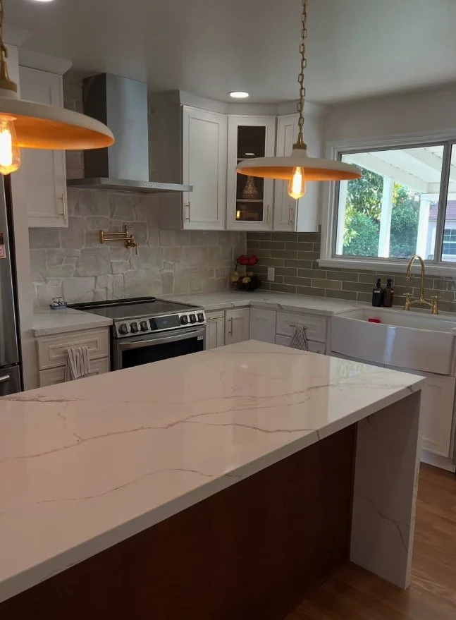 The island features a waterfall quartz countertop for a modern look and built-in appliances—a microwave drawer and a dual-zone wine fridge—for convenience. Warm wood cabinets on the island add contrast and richness. The perimeter has classic white shaker cabinets with gold hardware, a farmhouse sink, and brass fixtures. The mix of white and wood creates a balanced, custom feel. The backsplash combines natural stone near the stove and glossy subway tile on other walls, adding texture and depth. Stainless steel appliances and a sleek vent hood complete the modern style. Warm wood flooring ties the space together and keeps it welcoming. This kitchen stands out with beautiful countertops, custom cabinets, stylish tile, and durable finishes.