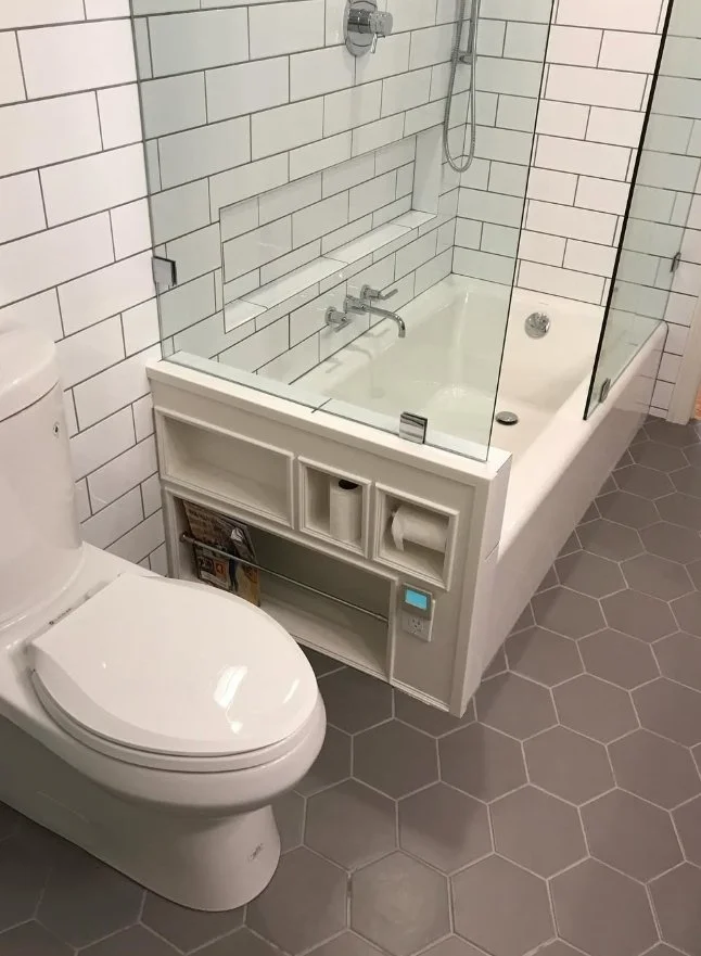The tub and shower surround features white subway tiles arranged horizontally, with a custom recessed shelf for storage. A frameless glass panel keeps the space open while preventing water splash. Modern, simple plumbing fixtures create a sleek, contemporary look. The floor has large gray hexagon tiles, adding style and easy maintenance. The vanity wall has floating wood cabinets to keep the room light. A solid surface countertop with an integrated sink offers a smooth, clean finish. Built-in shelves on the tub apron provide convenient storage and help keep the bathroom tidy.